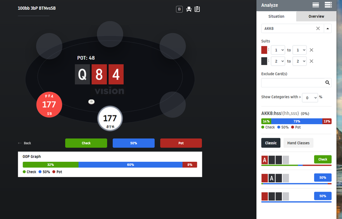 Я не знаю чего по твоей раздаче думать? Ты блочишь Q8, у тебя отличный блокер на ФД, есть дополнительное бекдорфд, ставка от оппа в треть пота более чем невнятная, коллить 3барреля по его правилам(включая бетсайзинг) тоже такое себе. На данный момент ты скорее всего сильнее оппа(мыж не будем класть только ДД оппу?), и в 3бетпоте без позы твоя задача к терну подготовить стек к пушу, паралельно выбиваем слабое эквити(но всё же эквити), а также даём понять что наш диапазон чека в 3бет поте не лыком шит, терном вышла охуенная карта, пуш и забыли про раздачу, даже если там вдруг иногда окажется Q8 или QQ... Раздача если что неинтересная