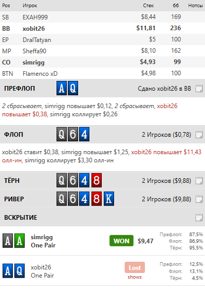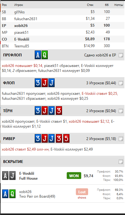 Вот еще одна раздачка из разряда глупых. Что по поводу нее думаете? опп 20/11 3бет 4% , fold3b 25%, wentoShd 30%, WWSF 37%,WonShd 55% Мои мысли, что такой опп будет рейзить только натсы. И максимум что мы можем сделать это колл флоп и чек/фолд терн