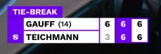 Тайбрейк в третьем у Гауфф и Тайхман - еще важно, что Тайхман левша, это меня тоже удержало от ставки на Гауфф, т.к. в 16 лет она еще совсем мало с левшами играла.