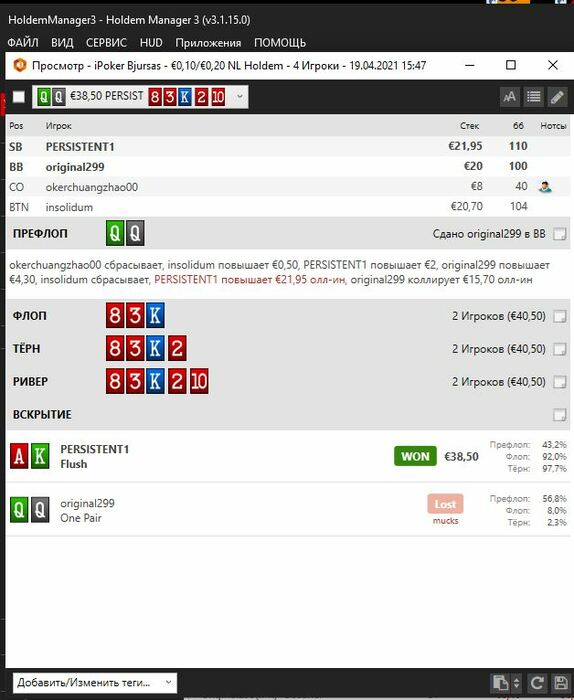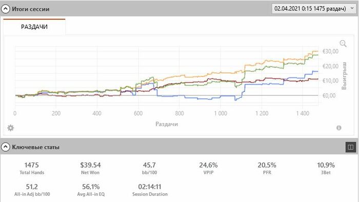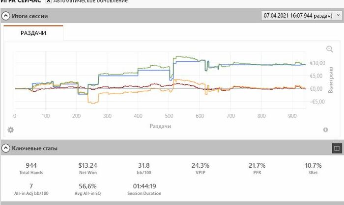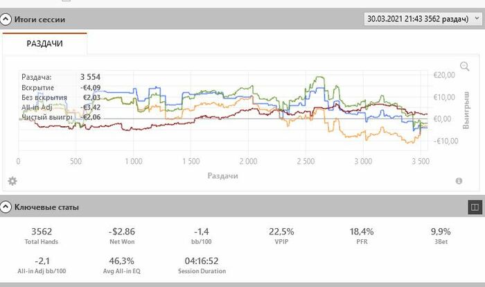 Hollseg, 10 столов, это от жадности наверно , хочется побыстрее 500 рейковых раздач откатать чтоб 5 евро получить. Сейчас в рамках курса столько столов+нехватка времени, как курс закончиться буду уменьшать до 4-6 столов. На самом деле я эксперимент такой решил провести для себя, я так вот уже вторую неделю катаю, было 12 столов и при этом я сужал свои спектры, я шел в нормальный плюс, а вот эта неделька минусовая пошла, но я вчера анализировал проригрышные раздачи при выставлении где я фаворит- все доезды оппам по 1-3 аутам.