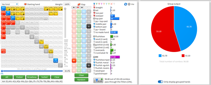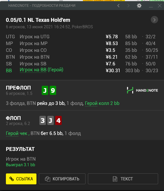 GaussfromHSE, допустим что фолд топ пары против такого соперника на потбет погранично и ближе к фолду. А вот например ещё один спот где против нас 35/21 с сибетом срп ип %80 и опен рейзом на батоне 52% тут мы уже никак не можем фолдить руку из топ 50% рэнжа ведь так?
