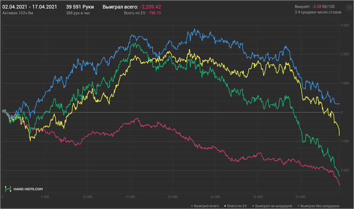 На самом деле менял, там где был период в ноль по ев, там анализировал базу и увидел, что была просадка в ранних позициях, поэтому какие-то вещи менял. Причем после изменений позиции выправились, но потом накрыло. И пока не очень понятно, поменял я в лучшую сторону или же нет) Вот эта неопределенность самое сложное, конечно, в покере)