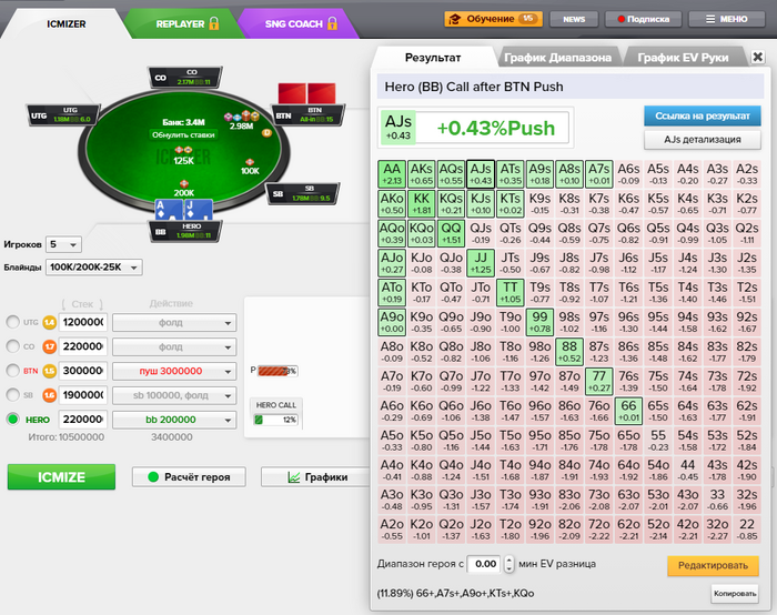 balwasik_19, я и подлочил до 29 ему потом (AJs - низ колла получился). не знаю, может он и шире бы пушил, чем 29.. второй скриншот на пять человек, но не с локом. жалко, что нельзя посчитать всё как надо, ну да ладно..