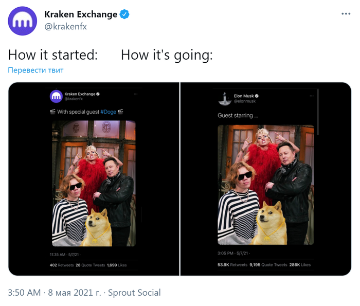 ну и камон. маск на снл 8 мая. ему задают вопрос типа "а как так доге с пика 30% потерял ты ж шилишь его как идиот почему честных граждан засаживаешь?"