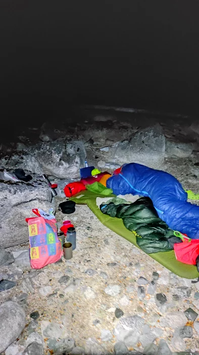 Весной водил сюда 64 летнюю маму, когда снега было больше. Тогда её снаряжением озаботились еще в России - горные ботинки с высокими гамашами. А Петю, утрирую, собирали с мира по нитке. Пуховка, ультралегкий рюкзак, пуховый спальник, вкладыш, палки - спасибо Маше. Треккинговые кроссовки, если есть уверенность в голеностопе - ОК, но без каких либо гамашей, которые я ему тоже предлагал, паузы на вытаскивания снега и камушков из обуви были обеспечены.
