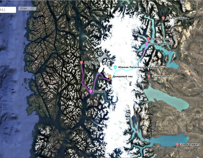 Пересечение Южного Патагонского ледового плато без использования автоматизированного транспорта (катер, вертолет, снегоход). Комбинированный пеше- водно- лыжный- ледовый маршрут.