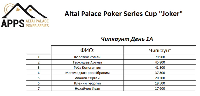 Самый большой стэк в кубке Джокера у Колотюк Романа (79,900), самый короткий стэк у Нехайчик Ивана (17,600). Но и это не всё, открываем еще одну номинацию: больше всего реэнтри за день)) тут соревнуются сразу 2 игрока Иванов Сергей и Кленин Георгий. Пусть в первом дне кубка игра не задалась, но именно эти 2 человека являются обладателями разных кубков летней серии APPS. Если с победой Иванова Сергея мы вас уже знакомили, то с чемпионством Кленина Георгия еще нет.