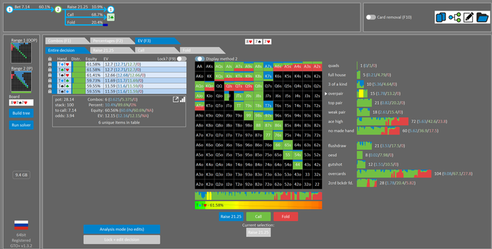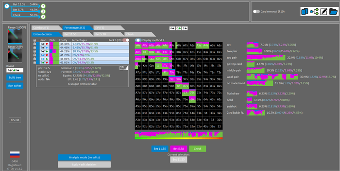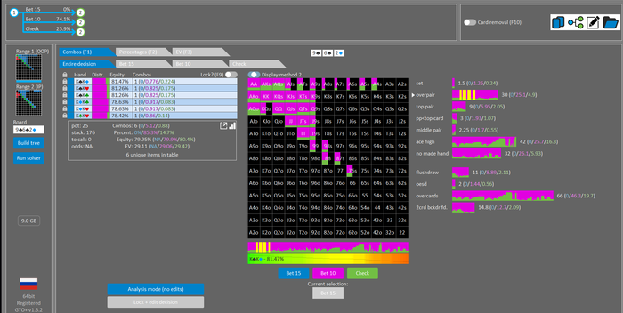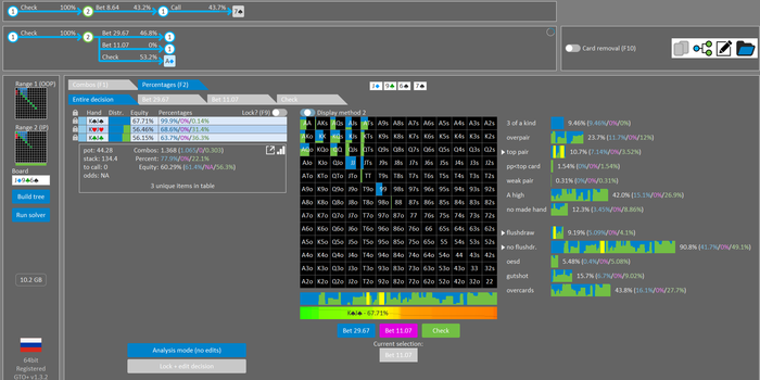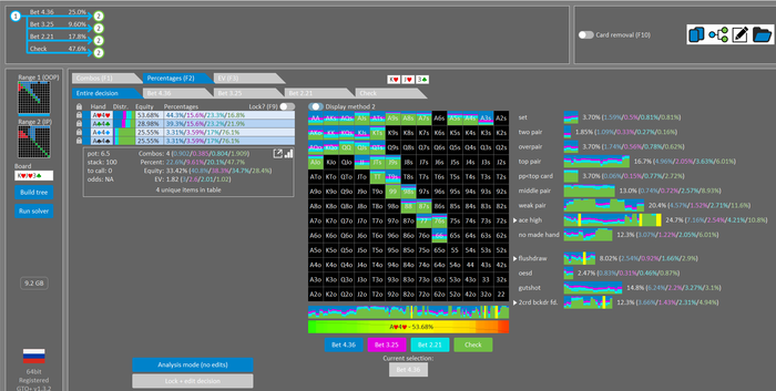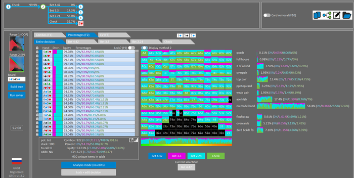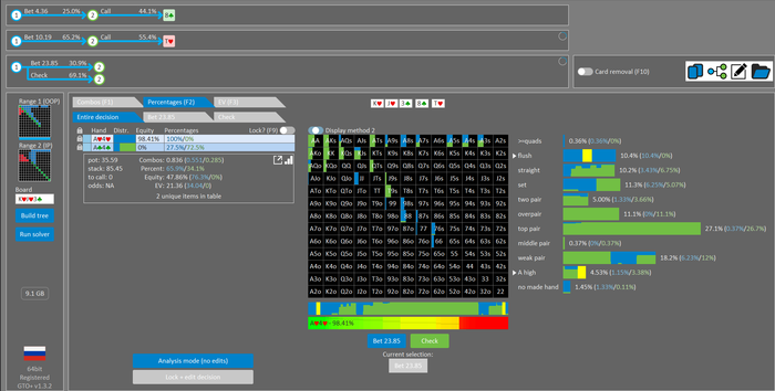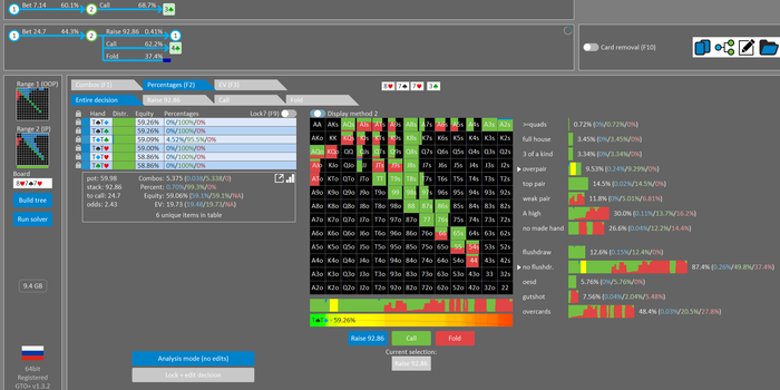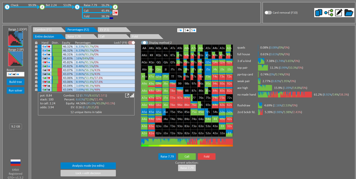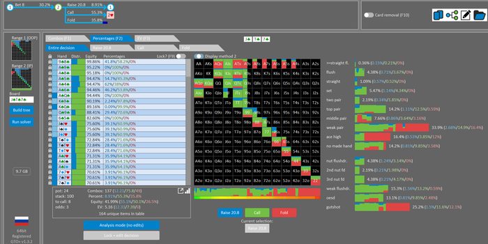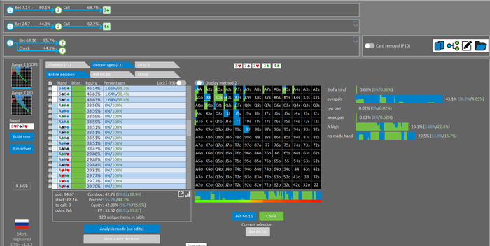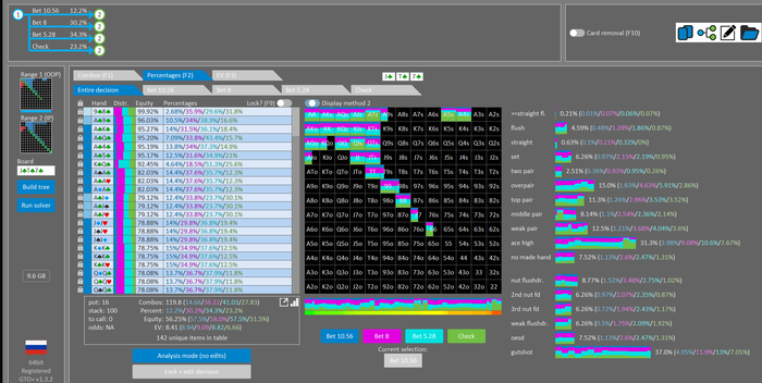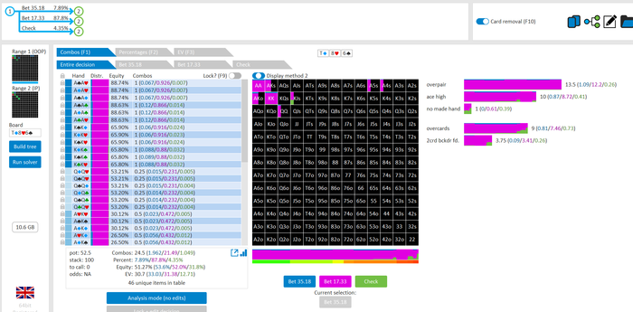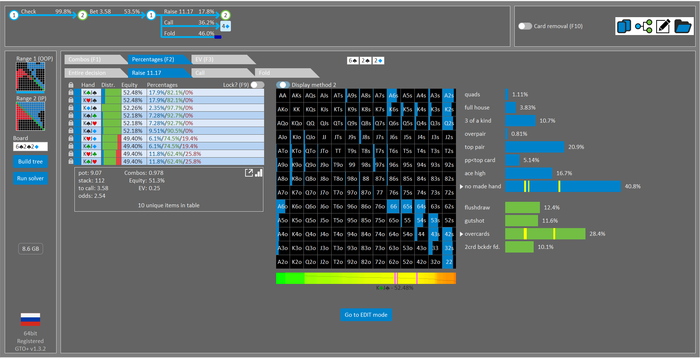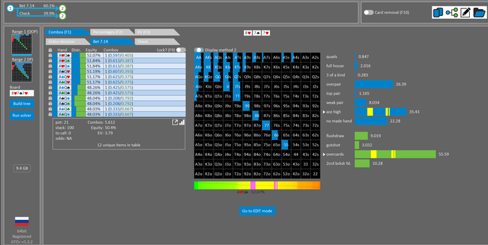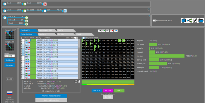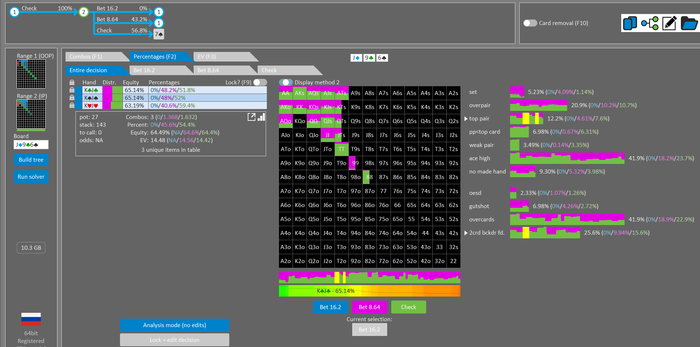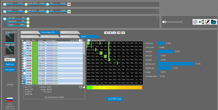 Rookee, по первой уже понятна ошибка бет тёрн. по второй странно что я не задал коннектора но они там есть 76-T9s , если бы он попал в свои натс опп бы поставил ривером. 3 овербетом пока не пользуюсь , на данный момент в солвере разбираюсь с ним, все комбодро-2пары+ всегда уйдут в рейз , посчитал его диап слабым , после овербета условно с АК мы часто чекнем на ривере тут да