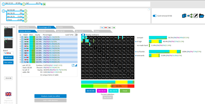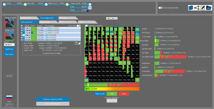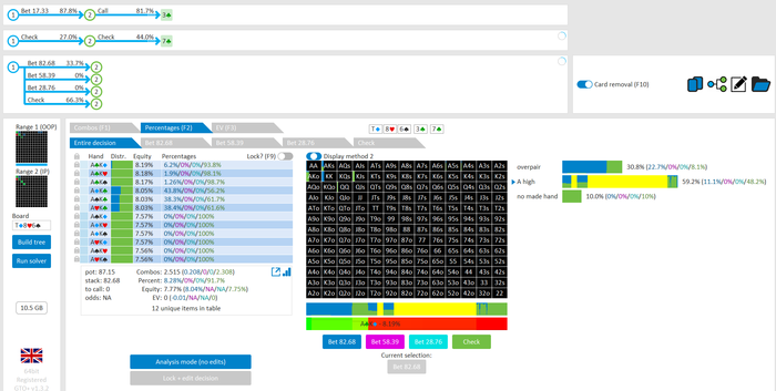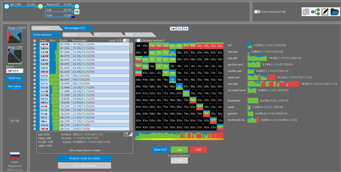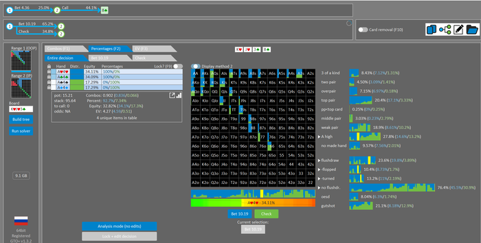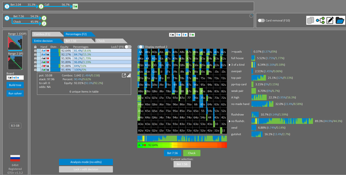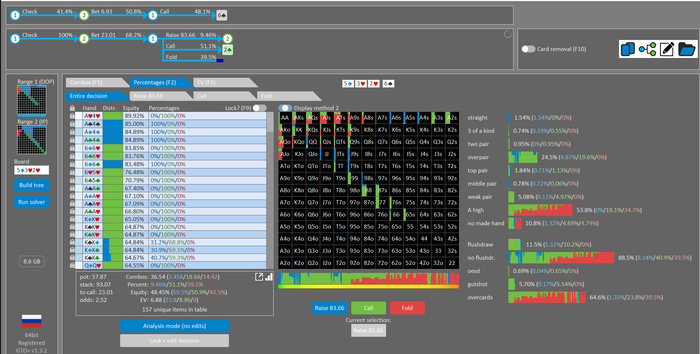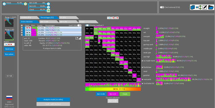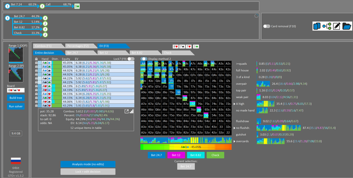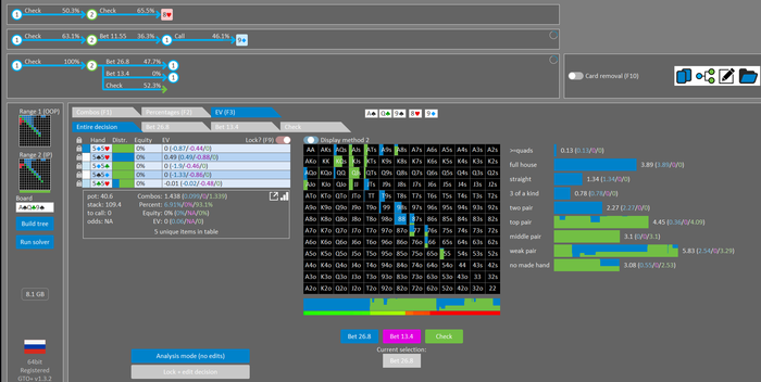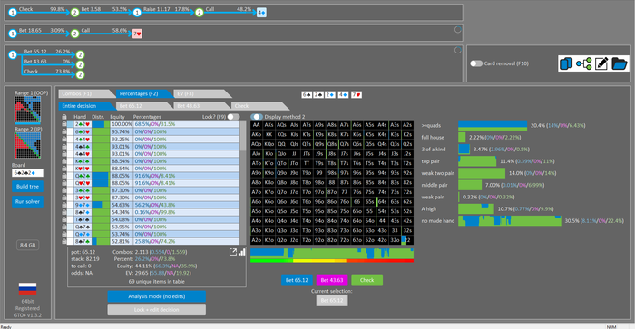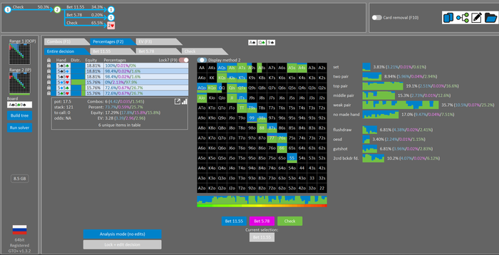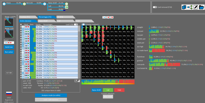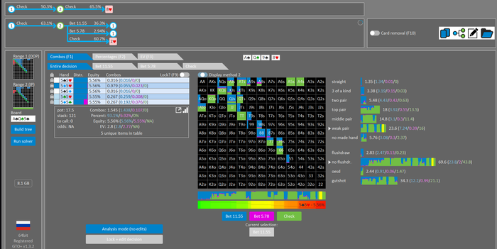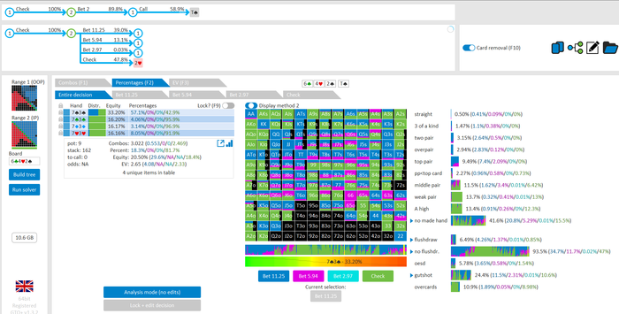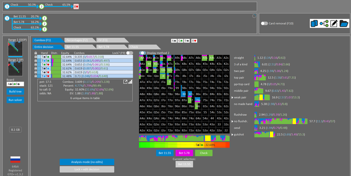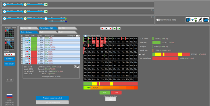 Rookee, по первой уже понятна ошибка бет тёрн. по второй странно что я не задал коннектора но они там есть 76-T9s , если бы он попал в свои натс опп бы поставил ривером. 3 овербетом пока не пользуюсь , на данный момент в солвере разбираюсь с ним, все комбодро-2пары+ всегда уйдут в рейз , посчитал его диап слабым , после овербета условно с АК мы часто чекнем на ривере тут да