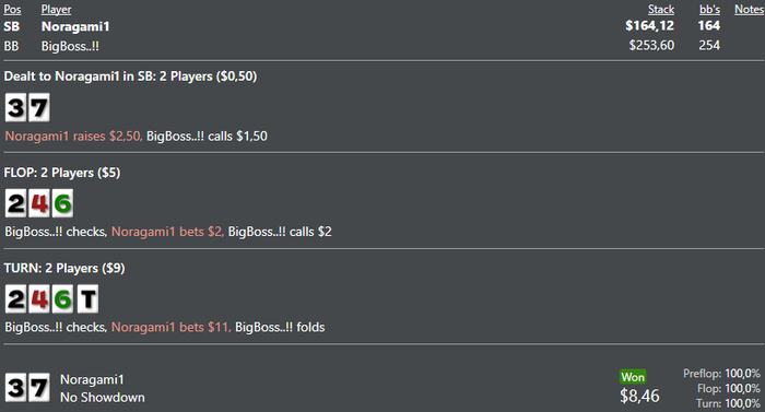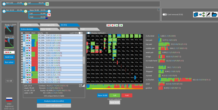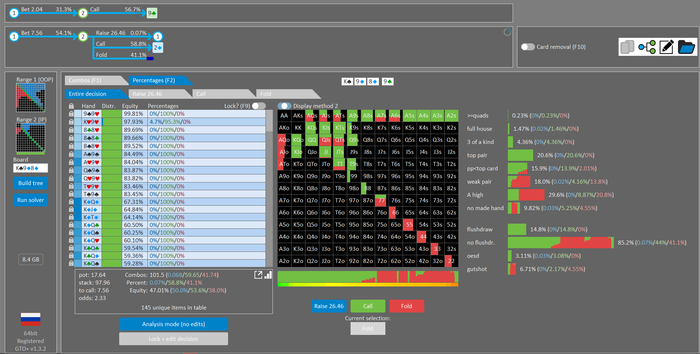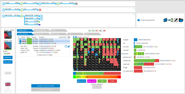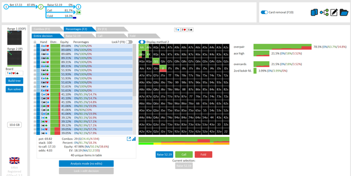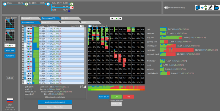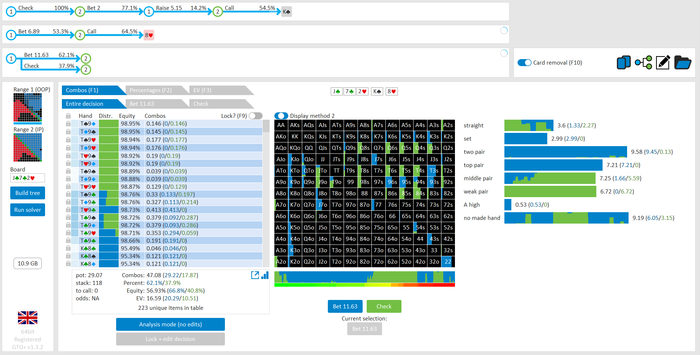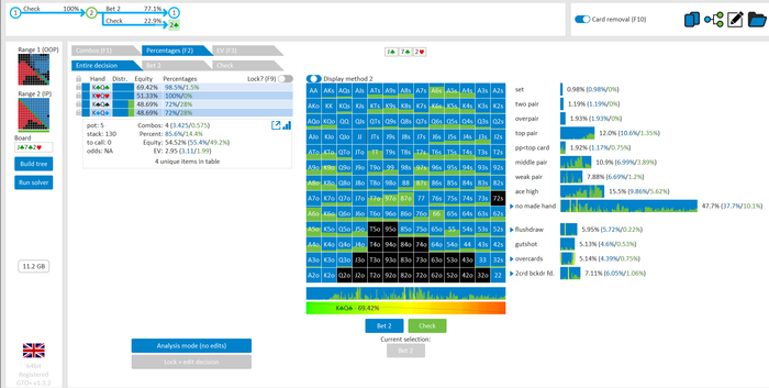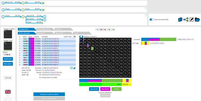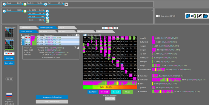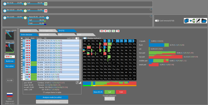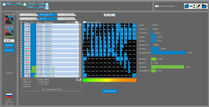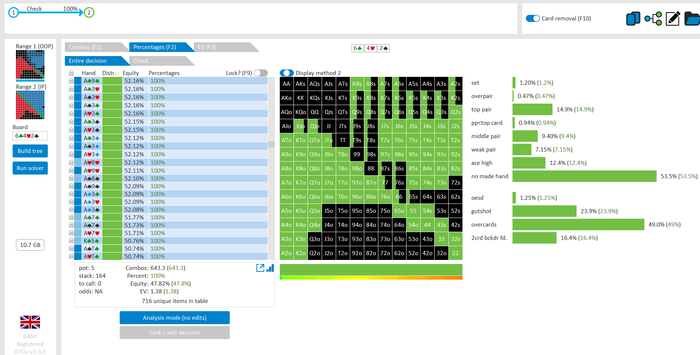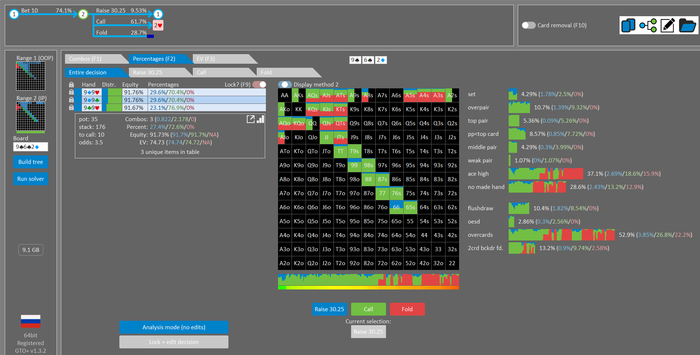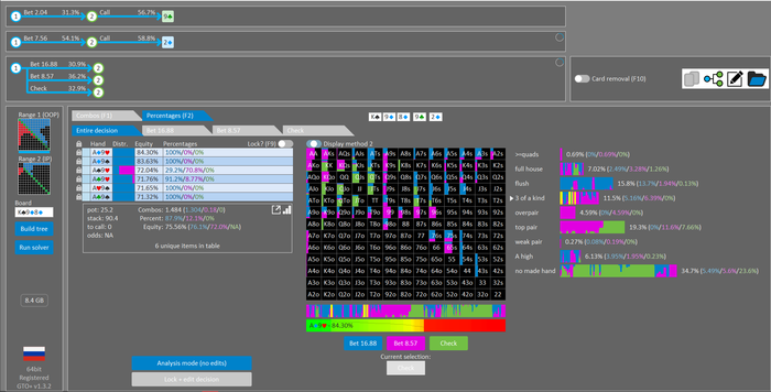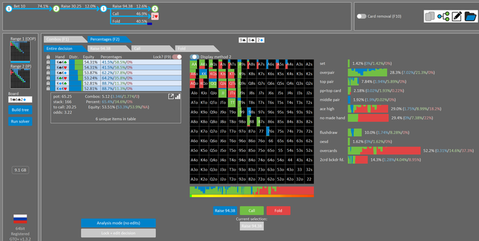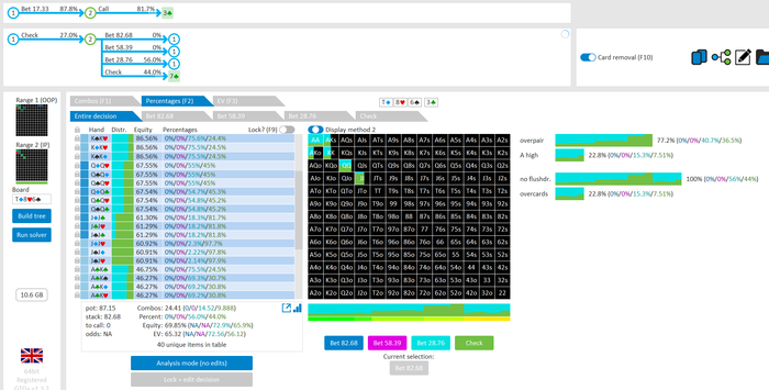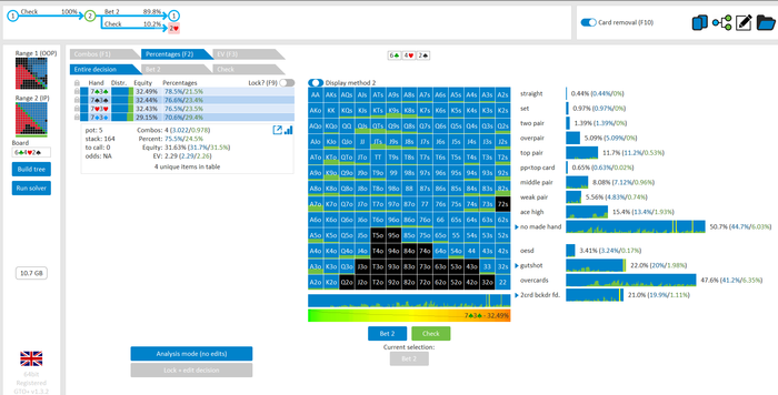 Rookee, по первой уже понятна ошибка бет тёрн. по второй странно что я не задал коннектора но они там есть 76-T9s , если бы он попал в свои натс опп бы поставил ривером. 3 овербетом пока не пользуюсь , на данный момент в солвере разбираюсь с ним, все комбодро-2пары+ всегда уйдут в рейз , посчитал его диап слабым , после овербета условно с АК мы часто чекнем на ривере тут да