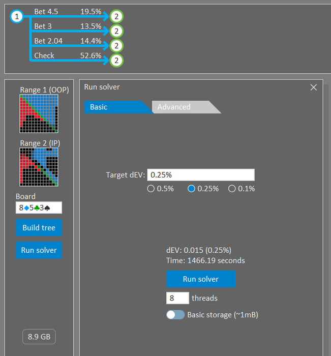 хз что давать солверу свободу выбору сайзов или его подгонять под сайзы оппа, я думаю всё таки под оппа. Раздача полностью меняется если у оппа есть сплит по сайзам если опп играет от 1/3 и 60% , то все ТТ без червы на тёрне пихаются , а с черовой колятся 75/25, в то время если опп играет только от 1/3 ТТ всегда колл, у меня была мысль пихать тёрн , но подумал будет доблефовывать.