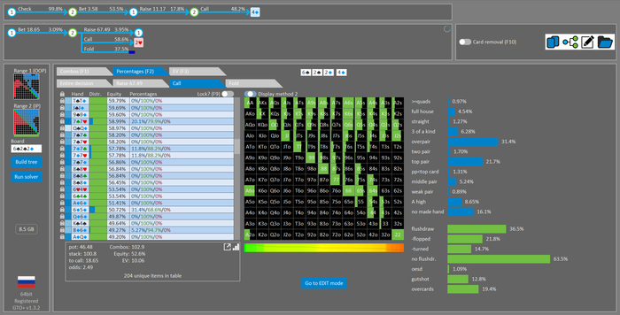 Тёрн: про опцию овербет вспомнил только сегодня , думал 3/4 хватит чтобы выбить то что он коллил, солвер конечно не одобряет бет 3/4 , а овербет как раз ему больше нравиться , но моя рука даже не рейзиться на флопе...