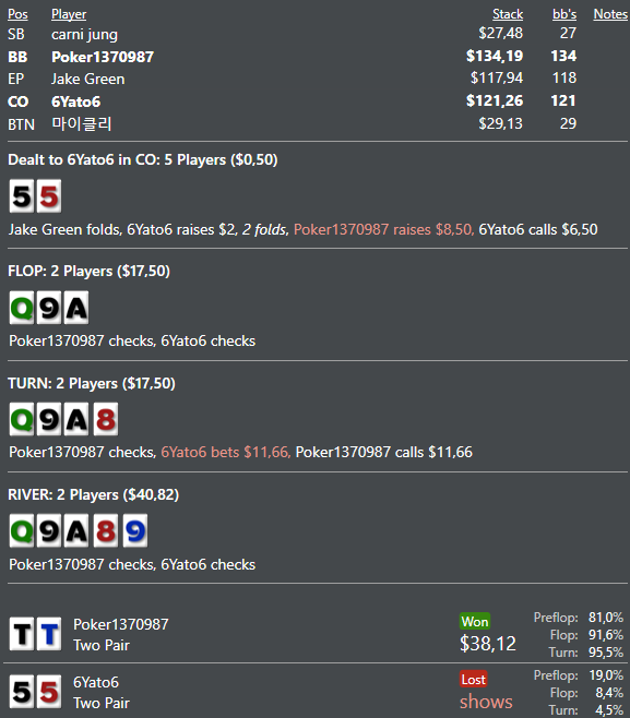 Ривер: А вот тут я уверен что он допихает все оверпары , прям жопу ставит , а в чеке недоезды только , смысла доблефовывать не вижу от него т.к у меня в свои червы т.к я что червы колить так буду? нет пихну на тёрне , думал надо допихивать вдруг будет блефкетчить, но иногда он так чекнет 99 JJ зассыт. Блефкетчит он только без черв , AQ конечно я не ожидал да ещё с червой, когда пихал бля , а он точно вколит свои ак?
