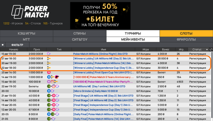 Main Event (Day 2) - до 23 августа, 12:00 и турнир хайроллеров Independence Cup - до 20 августа, 12:00.