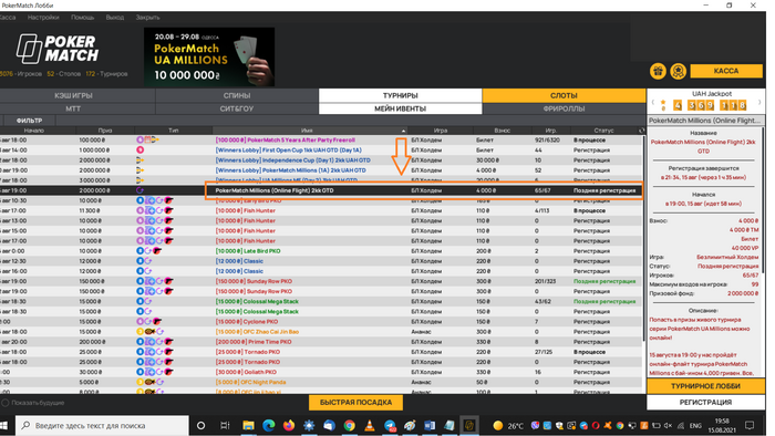Для того, чтобы зарегистрироваться в турнир в лобби игрового клиента PokerMatch вам нужно выбрать любой из трёх турниров и внести бай-ин: