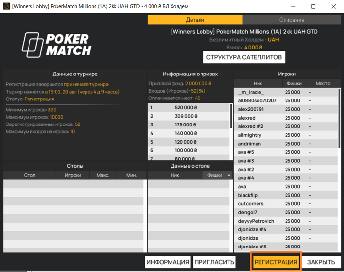 Открываете турнир [Winners Lobby] PokerMatch Millions (1A) 2kk UAH GTD в лобби PokerMatch, нажимаете "Регистрация", вносите бай-ин 4,000 гривен и вы в деле!