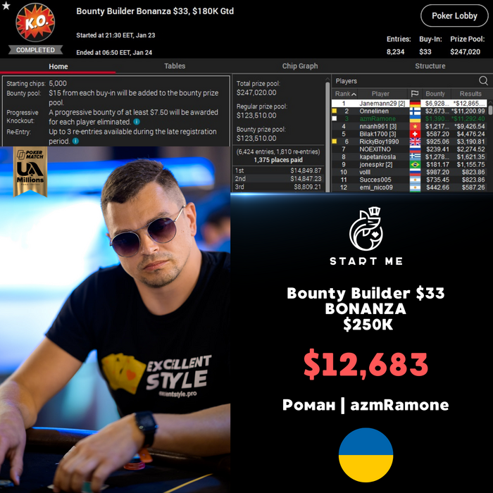 Топом декады команды StartME определенно и безоговорочно становится Роман | azmRamone благодаря дележке на финальном столе и ТОП 3 в турнире Bounty Builder Bonanza $33 на Poker Stars Роман отыграл 198 турниров, лучший занос — это дележка и третье место, а его общий профит за декаду составил 12.712$
