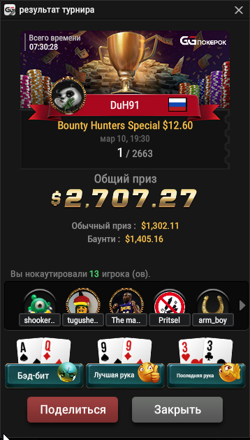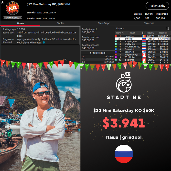 Была дележка в ХА. Павел занял второе место в турнире $22 Mini Saturday KO на Poker Stars а его выигрыш составил 3941$ а общий профит за декаду более 5 тысяч долларов.