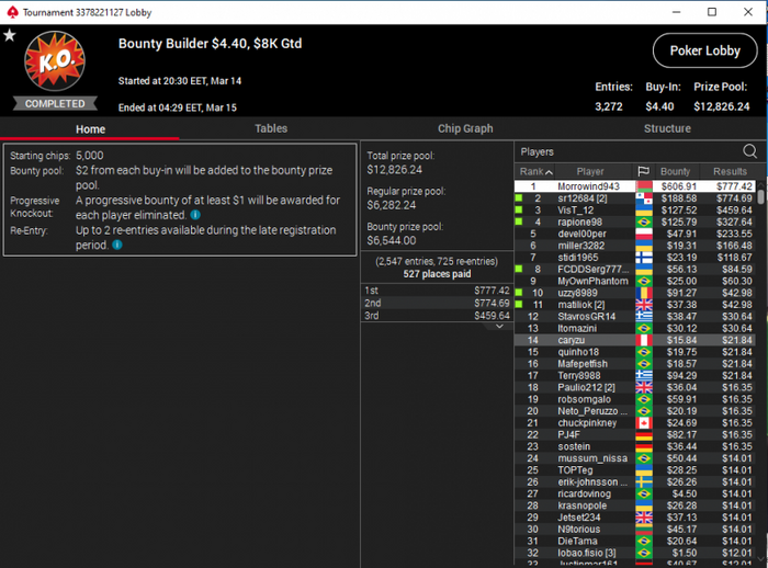 В топе списка не много игроков. Всего шесть ребят сделали профит более 1к$ (по данным сайта статистики sharkscope):