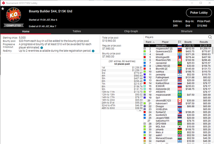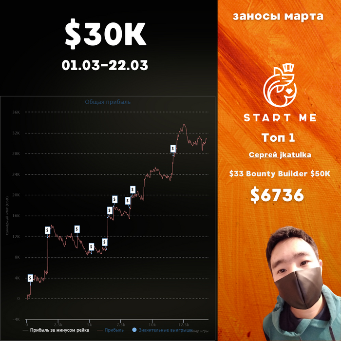 Супер крутой старт в марте у Сергея jkatulka. Его профит в марте уже более 7тыс$ при небольшой дистанции в 180 турниров 🥇