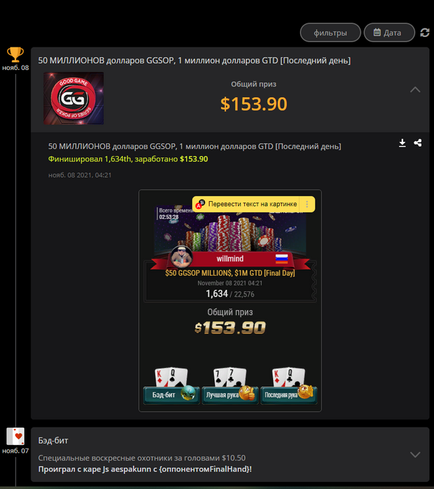 За эту неделю никаких серьезных побед, отобрался в 50$ глобал Миллион за 50 но во второй день пройти не удалось, идем дальше!