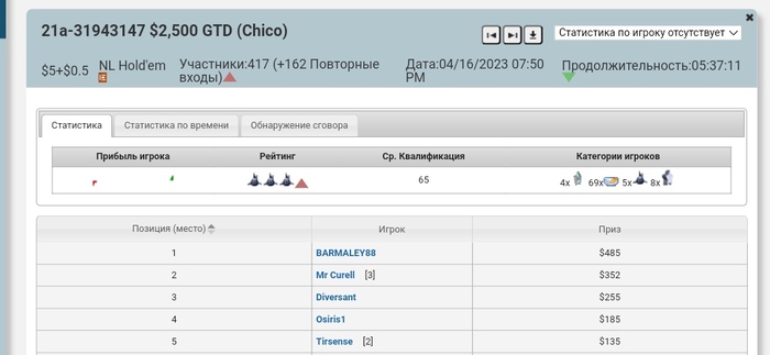 В мае буду пробовать подключать турниры за 11$ по одному за сессию, но только с низким АФС. Думаю турниры с CHICO отлично подойдут. Сейчас это мой любимый рум. Много любителей и турниры по 200-300 человек.