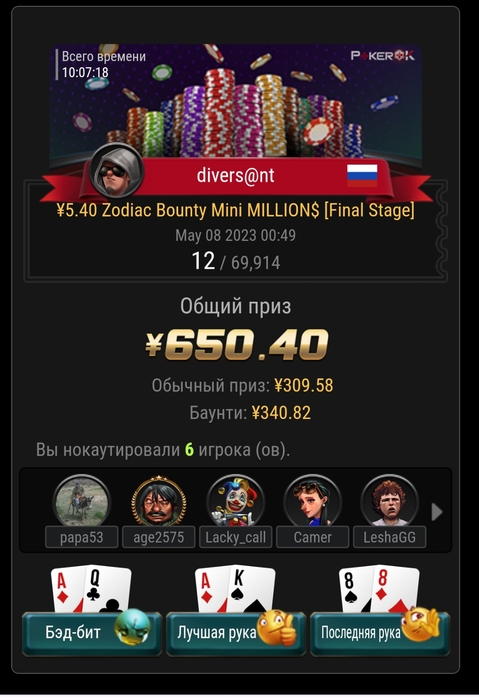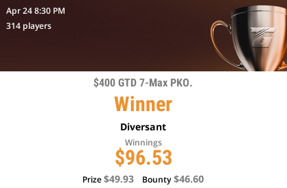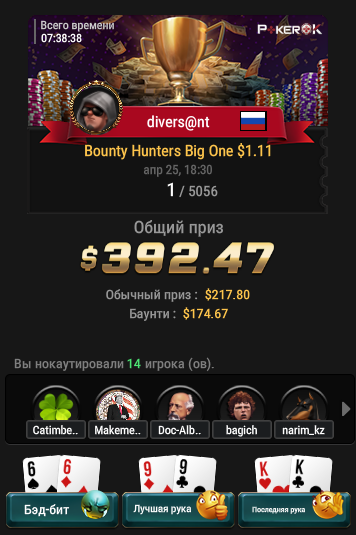 Давно покерок меня не баловал. Килополе всегда приятно тащить. Жаль, конечно, что турнир за 1.1, а не мистери баунти. Ну ничего и до него доберусь