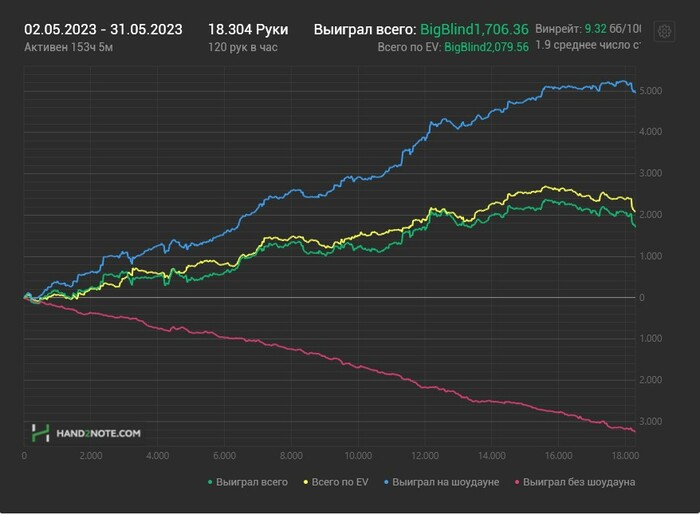 В июне играл мало (турниров 80) и играл ужасно, хотя, винрейты хорошие . В итоге наиграл на минус 107$ , а по итогу двух месяцев минус 170$. Лето, нет желания играть. Итак с осени все выходные в покере. Поэтому до сентября у меня отпуск. Я не в фонде и покер не основной источник дохода, так что имею право. Всем удачи и отличного лета