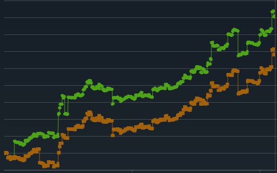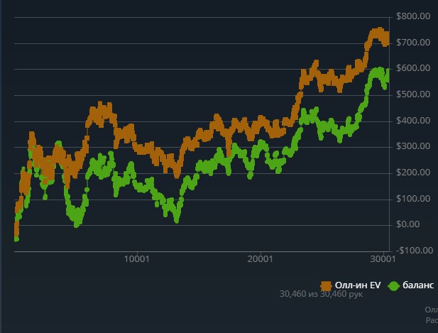 Из минусов ЕВ линия еще больше расходится с зеленой, уже на 300. Но без этого не было бы джекпота