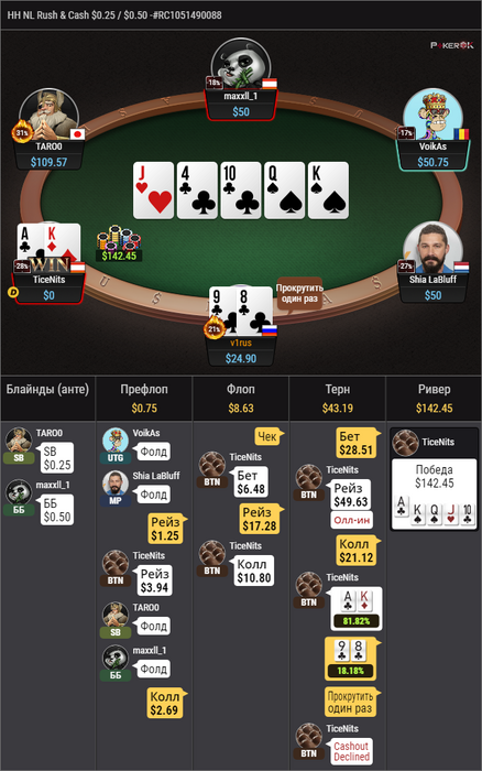 Чел помечен полурегом, но думаю что он должен понимать, что на такой структуре натсов у меня будет больше. И все равно чек-пушит на терне на плотную ставку в дипах. Поэтому выкинуть было бы лучше. А еще лучше пихнуть префлоп.