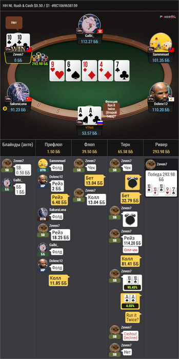 колл конечно граничный, но учитывая глубокие стеки и что на постфлопе тут катаются лицом по клаве обычно, вколил. Оппонент сыграл плохо (крупная флоп на такой доске + колл рейза с его рукой), что не помешало ему забрать банк