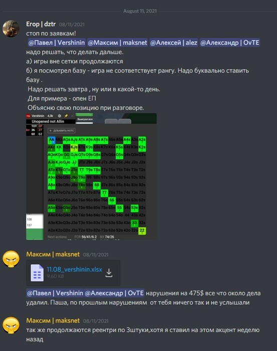 PasHTeT28 @ 23.10.21Нельзя прописать такой договор который все учитывает,потому что покер довольно специфическая вещь и там много нюансов которые просто нельзя прописать.Есть общие положения и здравый смысл.У человека явные проблемы с дисциплиной,скрины подтверждают что он соглашался с понижением лимитов и все равно нарушал.Если бы он сказал парни ничего не знаю есть договор,давайте следовать ему,а если что то не нравиться го в арбитраж.Мейк понятно списали.Но тут ситуация другая.