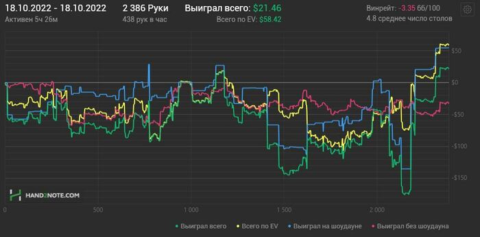 Начинаю играть не больше четырех столов, надеюсь уверенность вернется. Когда на старзах ввели ограничения, то я сперва расстроился, но как оказалось это положительно повлияло на мое покерное мышление и винрейт, мне на столько стало скучно играть четыре стола, что я наконец-то начал думать о том, что происходит за столами.