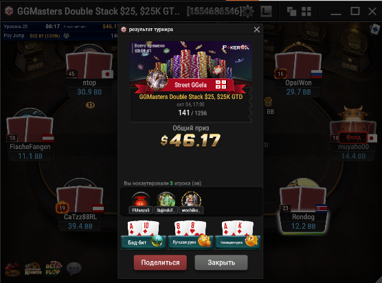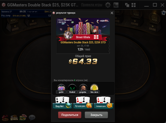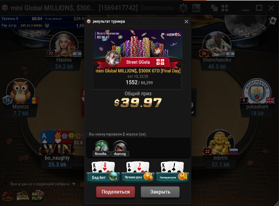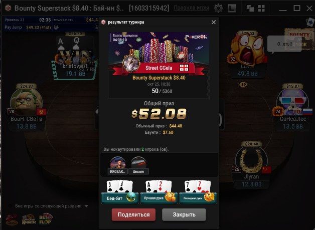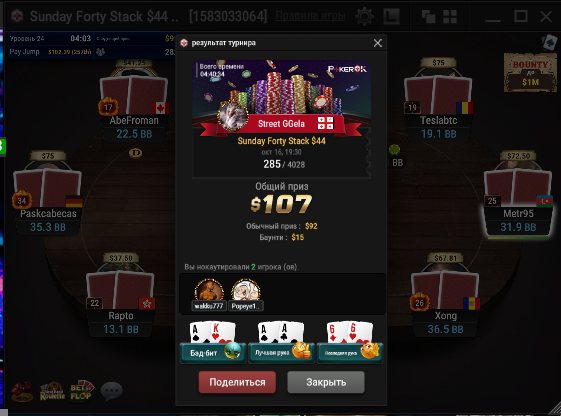 С 1 бб раскрутился до 7 и этот же пихнул 84o У меня А9о колл и две четверки приехали пацану ))) ««« не зажимается пацан