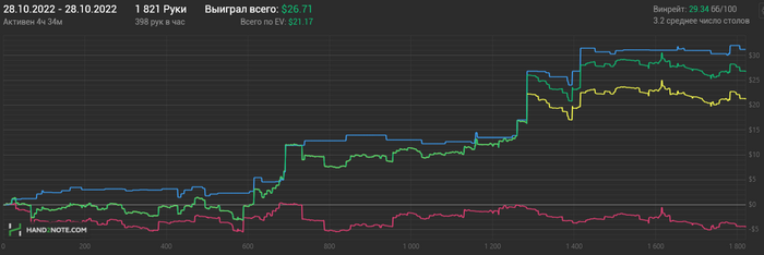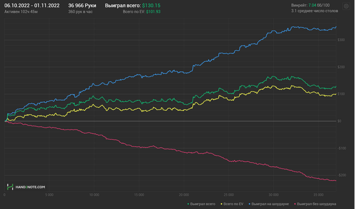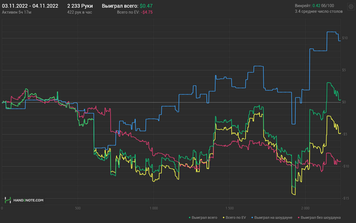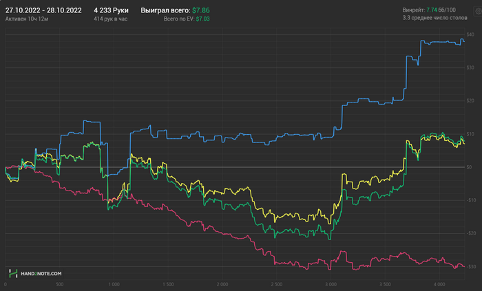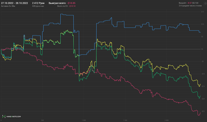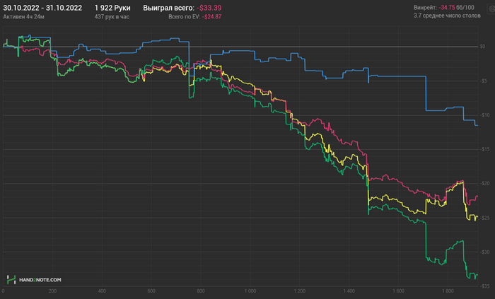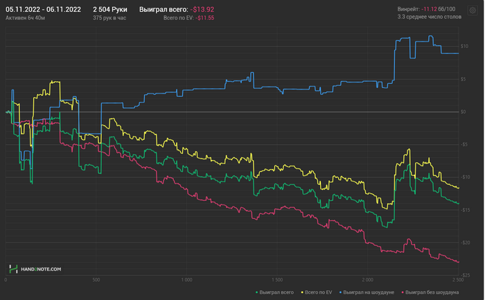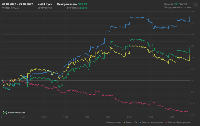 Сегодня, мне, отдохнувшему, выполнившему челендж, пришла "гениальная" идея, отыграть за 2дня, еще раз этот же челендж (около 7-8к рук). окло 20 часов на нл5... в целом я подумал, что хотябы попробовать можно... (ох какую же плохую шутку со мной сыграла эйфория и отсутствие дисциплины) и тут я решил, а может пойти на нл10))))) и челендж быстрее заработаю) в общем, забив на свои планы (200$ и ноябрь) я поперся творить вакханалию, за что в общем и поплатился.