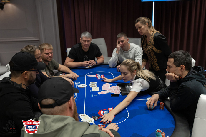 Василий Курдин залимпил с HJ, Генрих Бровченко уравнял на баттоне, Тавриз Тузаев и Дмитрий Винокуров на блайндах тоже пошли смотреть флоп.