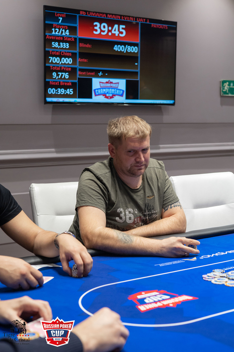 Завершился первый игровой день в Omaha Main Event с бай-ином 50,000 рублей. Сегодня было сделано 14 входов, и 12 игроков смогли пройти во второй день.