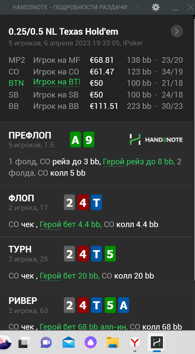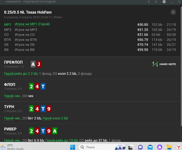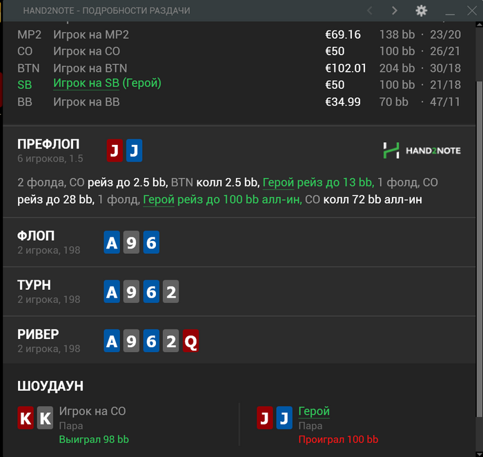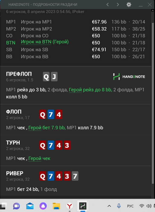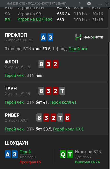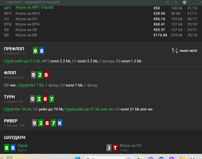Вечером прям поплыл, причина была в двух раздачах, которые были одновременно буквально за несколькими столами.