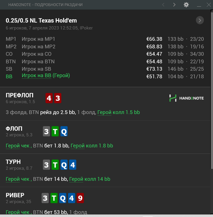 После обсуждение в конфе, нравится другая линия: чек терна, если оппонент чекает, 33 процента маленький добор. Если представим такой же сценарий, было бы (-3,63 и до терна -6,25 = -9,88). Итог ошибки: -40,12