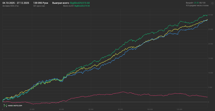 ☁️ Несмотря на минусовый месяц, считаю его отличным. В начале (https://t.me/borw1n_poker/1854) мне удалось шагнуть на новую ступеньку в своей карьере мттшника. Для меня, как и для многих, важен личностный рост и за последнее время прибавил в скилле прилично, особенно за последние 3 месяца когда попал в ФЛ. По факту аби30 не сильно отличается игрой от аби20, чуть больше сопротивления по верхам, но не более. Если усердно работать, то это вообще не помеха.
