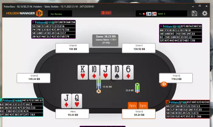 На флопе блайнд ставит донк 10бб и получает колл от утг, у блайнда в стеке больше 200 бб, у утг около 100, у меня остаётся 188 блайндов, в банке 58.5 бб и на такой доске я решаю сделать рейз алл-ин на велью