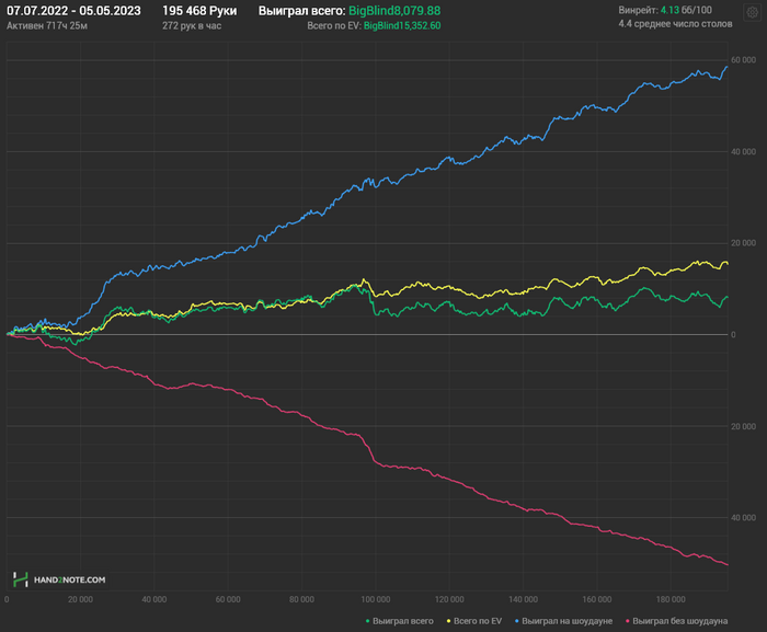 я не хочу ставить себе каких-либо временных рамок, но в моих интересах отыграть дистанцию как можно быстрее. сейчас я в среднем наигрываю 30 тысяч рук в месяц. учитывая, что хочу чуть сократить количество рук/час, думаю, как раз примерно в 2 месяца уложусь.