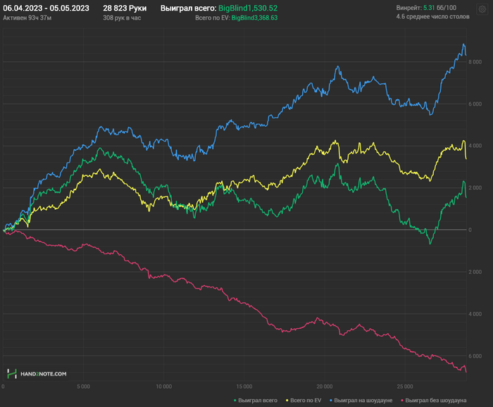Что я собираюсь поменять, чтобы так резко поднять свой вр? Во-первых, очень много времени уделить префлопу, во-вторых, снизить количество играемых столов (сейчас при 400 руках в час при всём желании такой винрейт показывать не получается), в-третьих, максимально поднять уровень концентрации, внимания и фокуса.