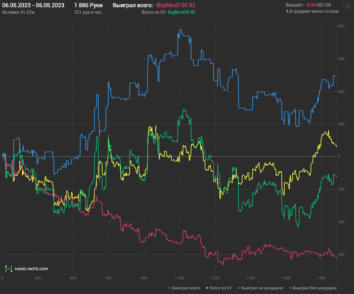 Вообще за 4к рук при подробном разборе сессий я насчитал больше 10 лишних отданных стеков. Причина почти всех ошибок - не успевал обдумать решение, то есть, было слишком много столов. Сегодня снова сел с установкой играть меньше столов, по итогу первая сессия была рекордной за последнее время: 450рук/час. Те необучаемые свиньи, о которых говорил Инвокер, просто безобидные хрюшки по сравнению со мной. Это ж выходит, что за эти два дня насдавали на все 50+евбб/100. Интересно, сколько ещё мыш будет плакать и продолжать жрать кактус.