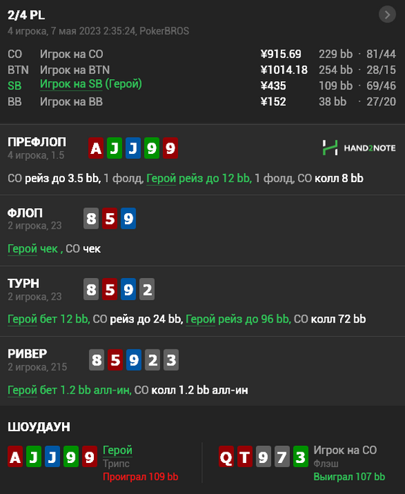 В одном из клубов на ГГ не запустился трекинг, где я буквально за 30 рук забрал у фиша 2,5 стека) И ещё почему-то в эти два дня было сразу несколько подобных раздач с допихом <10бб на ривере вмёртвую: