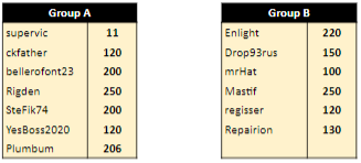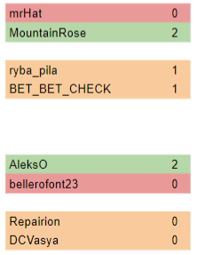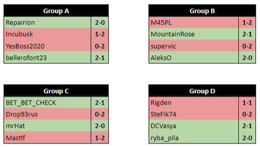 В группе B, которую полноправно можно назвать "группой смерти" не повезло M45PL, установившему рекорды выхода группового этапа (116), но не сумевшему реализовать темп в центре. В группе "новичков" C, удача и мастерство сопутствовали BET_BET_CHECK и mrHat, а в сильной группе D ryba_pila неожиданно опередил фаворита DCVasya.