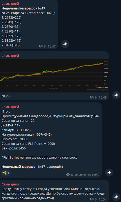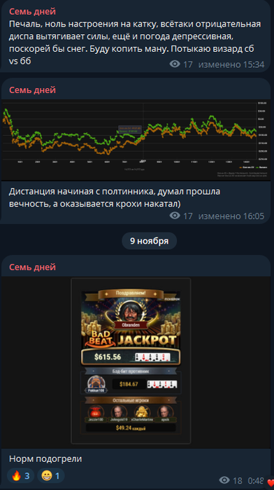 Всё пацаны и девчонки, я выгорел и катать не могу, нужен отдых без бухла, а лучше смена деятельности. Помарафоню музицирование, поучу английский. Ща катаю через силу и это не очень хорошо на дистанции. Плюсом брать у себя "кредит", как я понял, это плохая затея, которая тянет дополнительно энергию и становится обузой - не мотивирует. Прощу себе долг, сделаю кешаут и подведу итоги уходящего года. Эти три месяца были хороши, до этого так быстро у меня не рос банкролл, обычно всё заканчивалось кешаутом как только я подбирался к 1к$ и оставлял условные 50$ на раскрутку. Сейчас довольно крепкий банкролл и меня это радует. Продумаю новый план с новыми известными(выгорание), в новом году усовершенствую марафоны, кажется, 7 дней это много без отдыха - нужно отдыхать посреди недели.