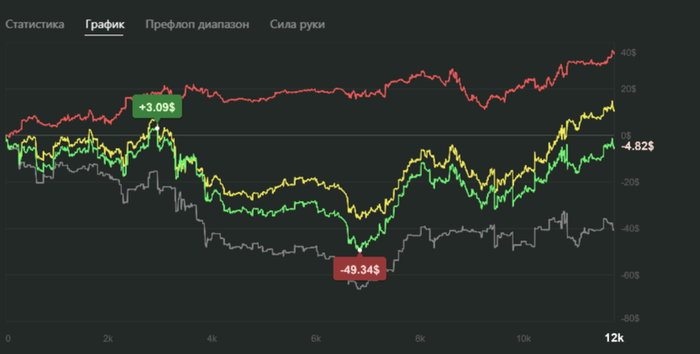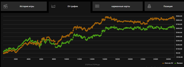 Раздавали, конечно, грустно, и играл без селекта, как и дистанция ни о чем (в декабре еще 25-50 там играл ~ 12к раздач и -200 по факту и по ев +300). К слову, почему-то h2n некорректно EV считал в выставлениях. Бывало, что едешь в монетку и первую крутку проигрываешь, и тогда h2n рисует EV отрицательный для выставления, будто ты поехал в 25% или типо того. На графике на 300-400$ должно быть больше, но тем не менее ран прям не очень.