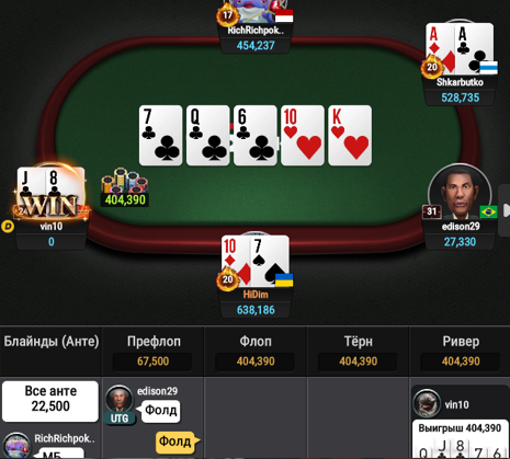 Также оставалось еще 2а стола. Я постарался собраться и играть более внимательно. По итогу вышел на финалку. И вспомнил, что вчера я себе сказал НЕ ПЕРЕЖИВАТЬ НА ФИНАЛЬНОМ СТОЛЕ, а играть в свою игру! И первая раздача, у всех +- 6-20 бб, я на большом и вижу откровенный стил - запихиваю алл-ин с AJ(он сфолдил) и понимаю "меня попустило" можно доигрывать в своем темпе и не важно что будет. Забрал немного с этого турика: