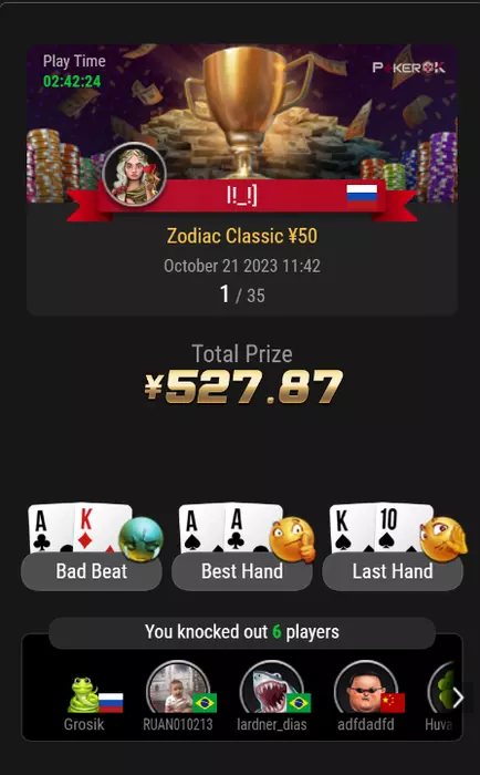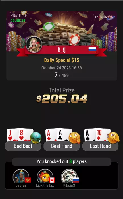 Затащил топ1 в мелком турике, раскрутившись с 0.3бб из топ8 Когда выиграл четвертый или пятый оллин подряд, бразилец написал в чате, что ГГ уже определил победителя турнира и так оно и оказалось! А на второй финалке всю дорогу сидел с 6-12бб в топ4, потом вышел в хедзап с 6бб против 60, и даже удалось почти сравнять стеки. Но лак закончился и все же топ2.